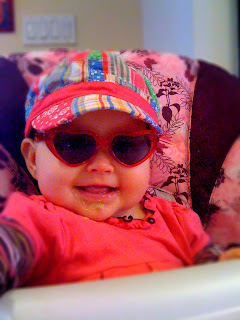 She is still not crawling and could care less. She will get up on all fours and go no where. Everyone says if she really wants something she will go it but I don't think she will. Who knows? She does have a mouth full of teeth. I think her 7th tooth is currently coming in! She loves any kind of cracker to snack on. Everything goes into her mouth! EVERYTHING! We have just started to work really hard on the sippy cup and it's not going as easy as everything else has. She doesn't like it! I didn't think that she was very attached to the bottle but she obviously is.